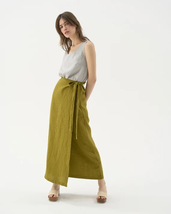 Earth-toned wrap skirt made from breathable linen, ideal for summer.