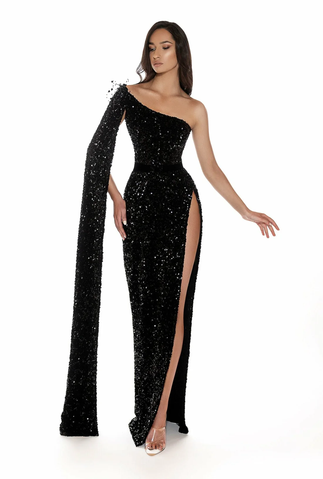 A sleek black long dress with a subtle slit and off-shoulder design.